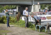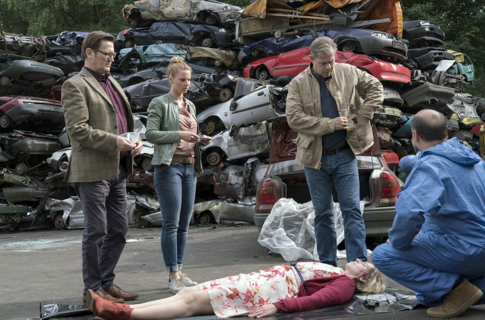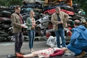 Der Tod ist nicht das EndeAuf einem Schrottplatz wird im Kofferraum eines Autowracks eine Leiche gefunden. Lars (Ingo Naujoks, l.), Nina (Julia Schäfle, 2.v.l.) und Finn (Sven Martinek, 2.v.r.) erfahren von Dr. Strahl (Christoph Tomanek, r.), dass Sophie Jensen erschlagen wurde.Bild: © ARD/Georges Pauly