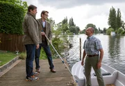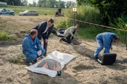 Mann am SpießDr. Strahl (Christoph Tomanek, l.), Finn Kiesewetter (Sven Martinek, M.) und Sandra Schwartenbeck (Marie-Luise Schramm, r.) am Tatort. Philip Ahrens (Tobias Fries, liegend), Spross einer angesehenen Lübecker Industriellen Familie wurde von einem Wurfspeer durchbohrt.Bild: © WDR/ARD/Georges Pauly