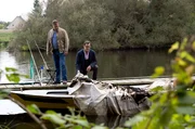 Schwarzer PeterDie Spurenlage führt Finn (Sven Martinek, l.) und Lars (Ingo Naujoks, r.) zu einem ausgebrannten Segelboot.Bild: © ARD/Georges Pauly