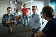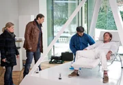 Hinter der FassadeFinn (Sven Martinek, 2.v.r.) und Lars (Ingo Naujoks, r.) erhoffen sich Erkenntnisse von Dr.Euler (Yasmina Djaballah, l.).Bild: © ARD/Sandra Hoever