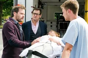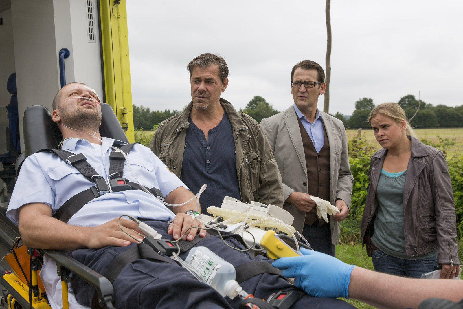Am LimitEin maskierter Mann hat mit einer Panzerfaust einen Geldtransporter überfallen, der Fahrer Tom Benneke wurde schwer verletzt. V.l.n.r. Tom Benneke (Timo Hübsch), Finn Kiesewetter (Sven Martinek), Lars Englen (Ingo Naujoks), Sandra Schwartenbeck (Marie Luise Schramm).Bild: © ARD/Georges Pauly
