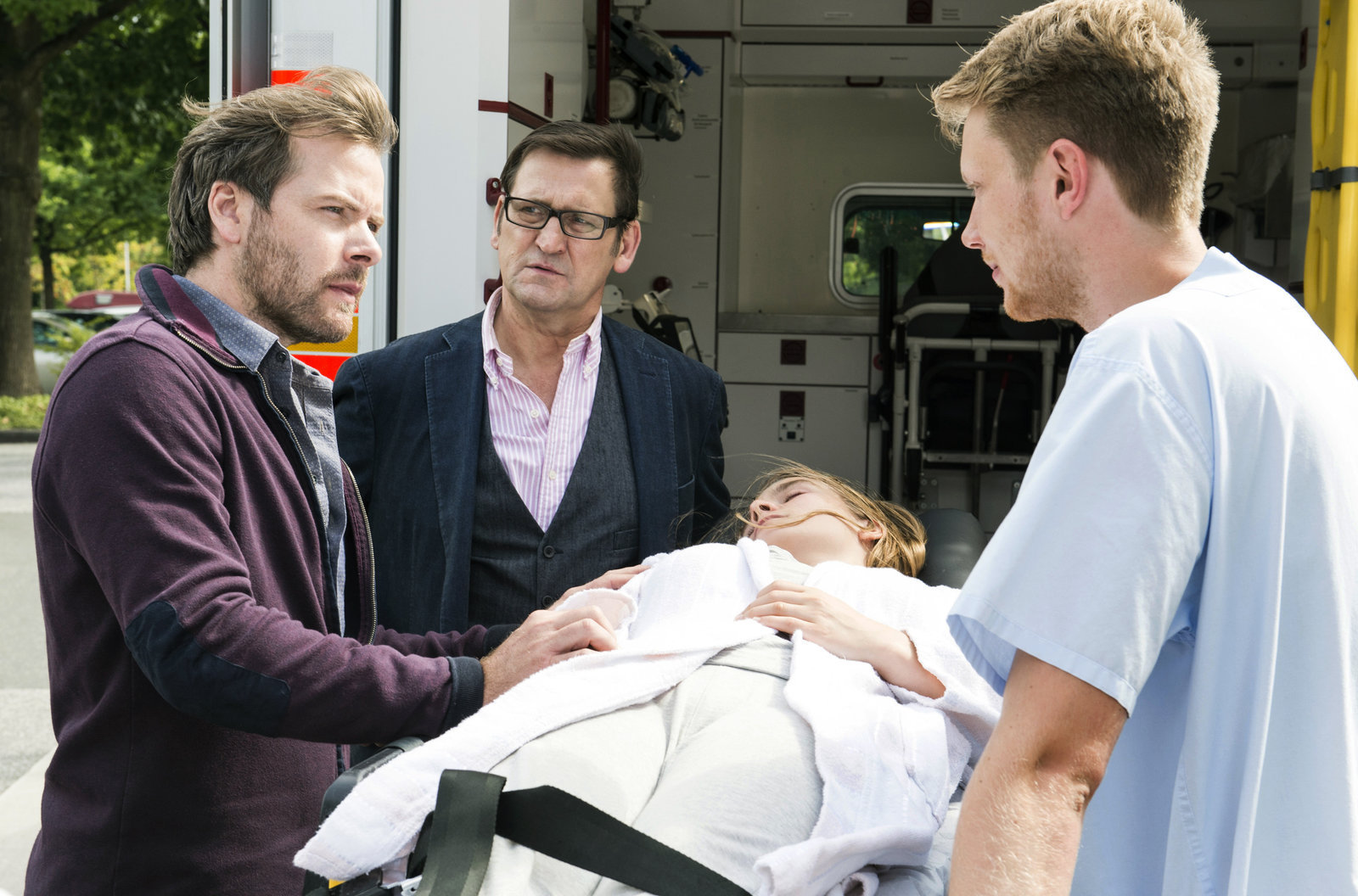 KellerkindMarkus Dorn (Nicholas Reinke, l.), will sich um Stella (Anna Schimrigk, M.) kümmern (mit Ingo Naujoks, 2.v.l. und Komparse, r.).Bild: © ARD/Sandra Hoever