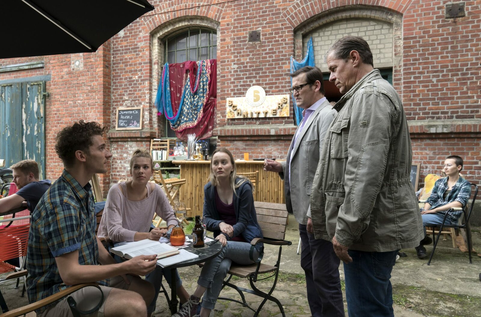 Helfer in der NotDurch David Kutadas (Juri Senft, l.) Befragung hoffen Ida (Amelie Plaas-Link, 2.v.l.), Tomke (Anjorka Strechel, m.), Lars (Ingo Naujoks, 2.v.r.) und Finn (Sven Martinek, r.) den Tathergang genau rekonstruieren zu können.Bild: © ARD/Marion von der Mehden