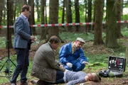 Im NetzDie 17-jährige Nadine Bomke (Marie Bendig, liegend) wird von ihrer Schwester Paula mit einem Kopfschuss tot im Wald aufgefunden. Pathologe Dr. Strahl (Christoph Tomanek, r.) erklärt Lars Englen (Ingo Naujoks, l.) und Finn Kiesewetter (Sven Martinek, M.) seine erste Einschätzung zu dem Fall.Bild: © MDR/ARD/Georges Pauly