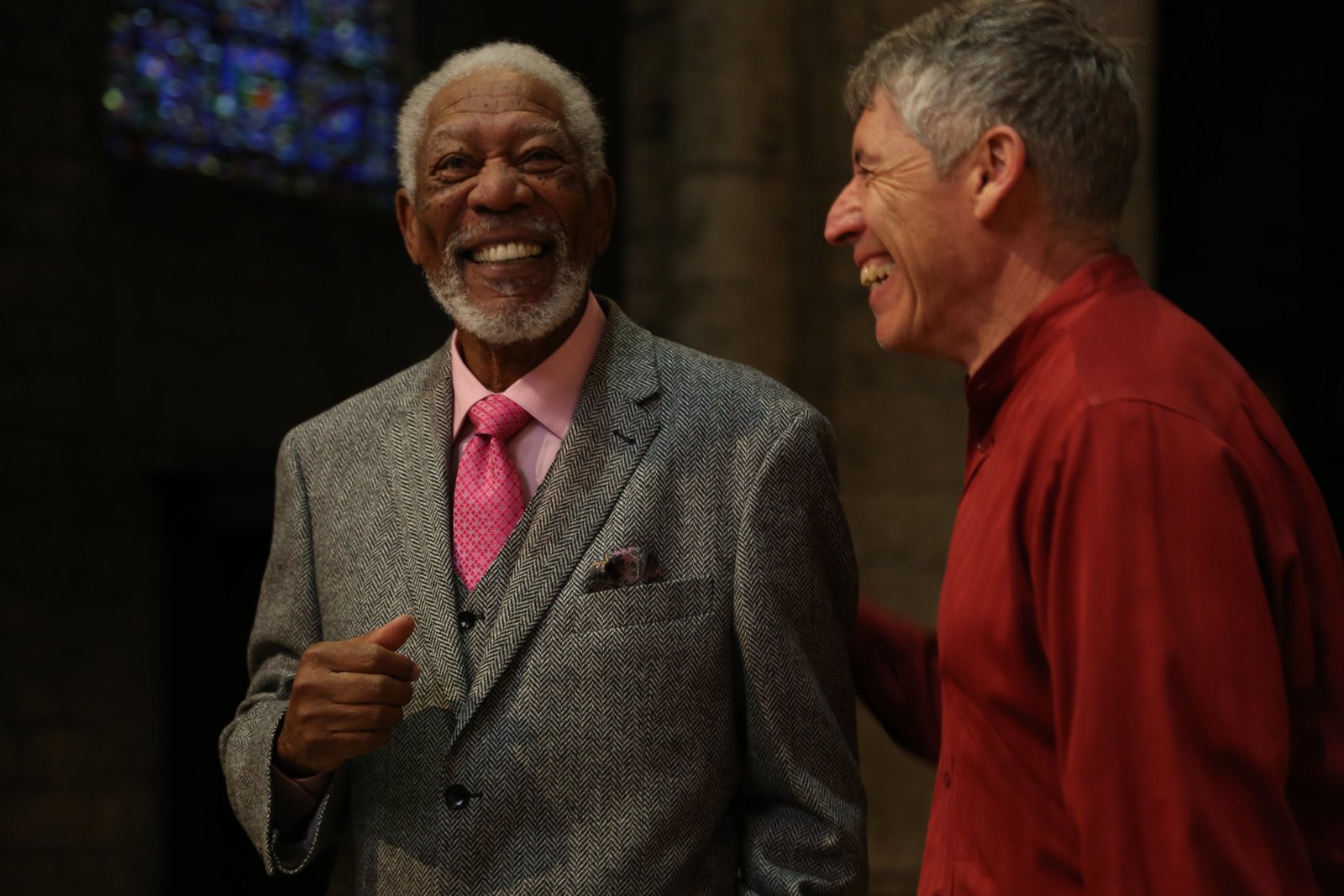 Göttliche VisionenMorgan Freeman laughs with Julio Bermudez at the Chartres Cathedral.Bild: © National Geographic / Maria Bohe