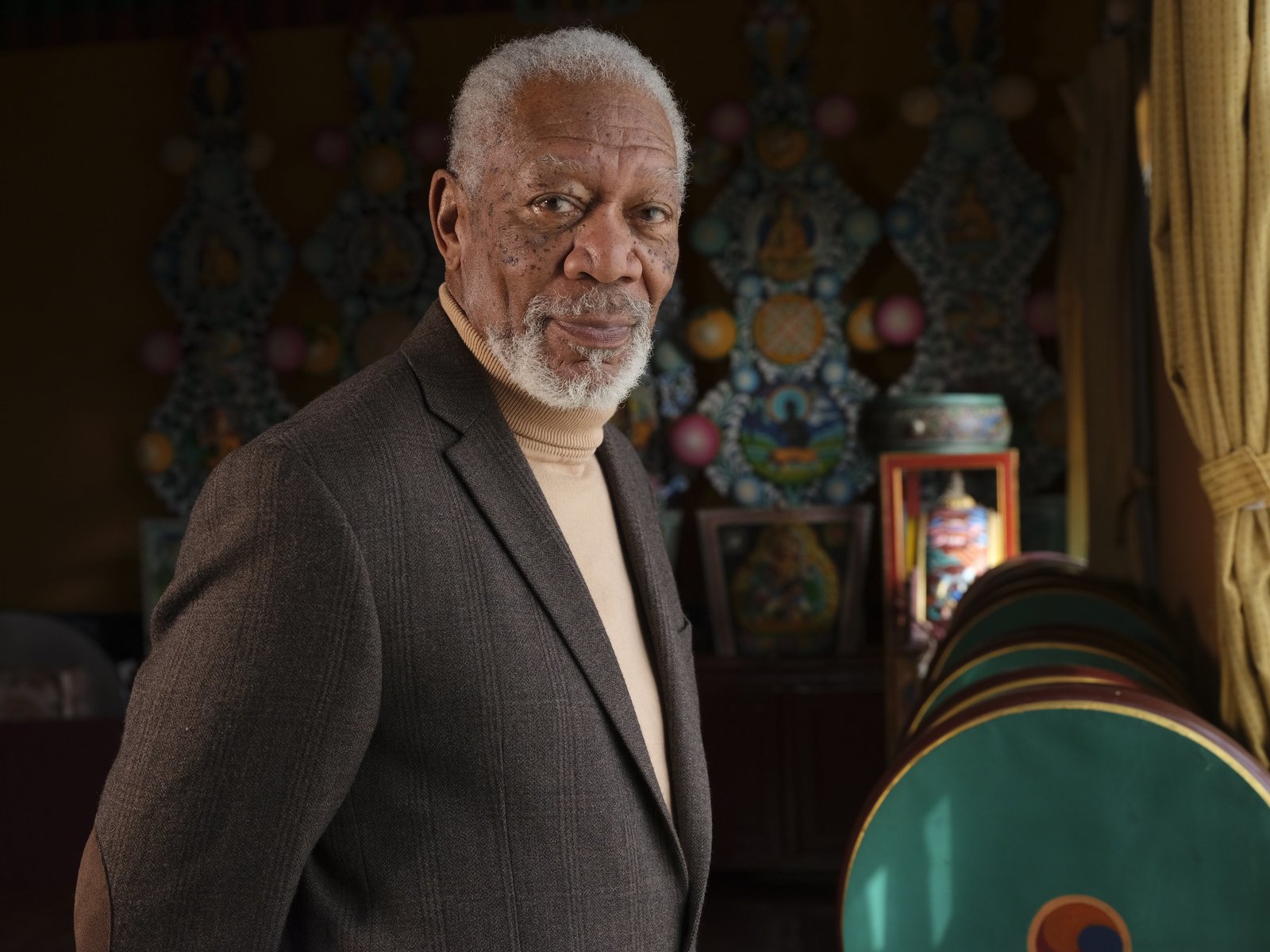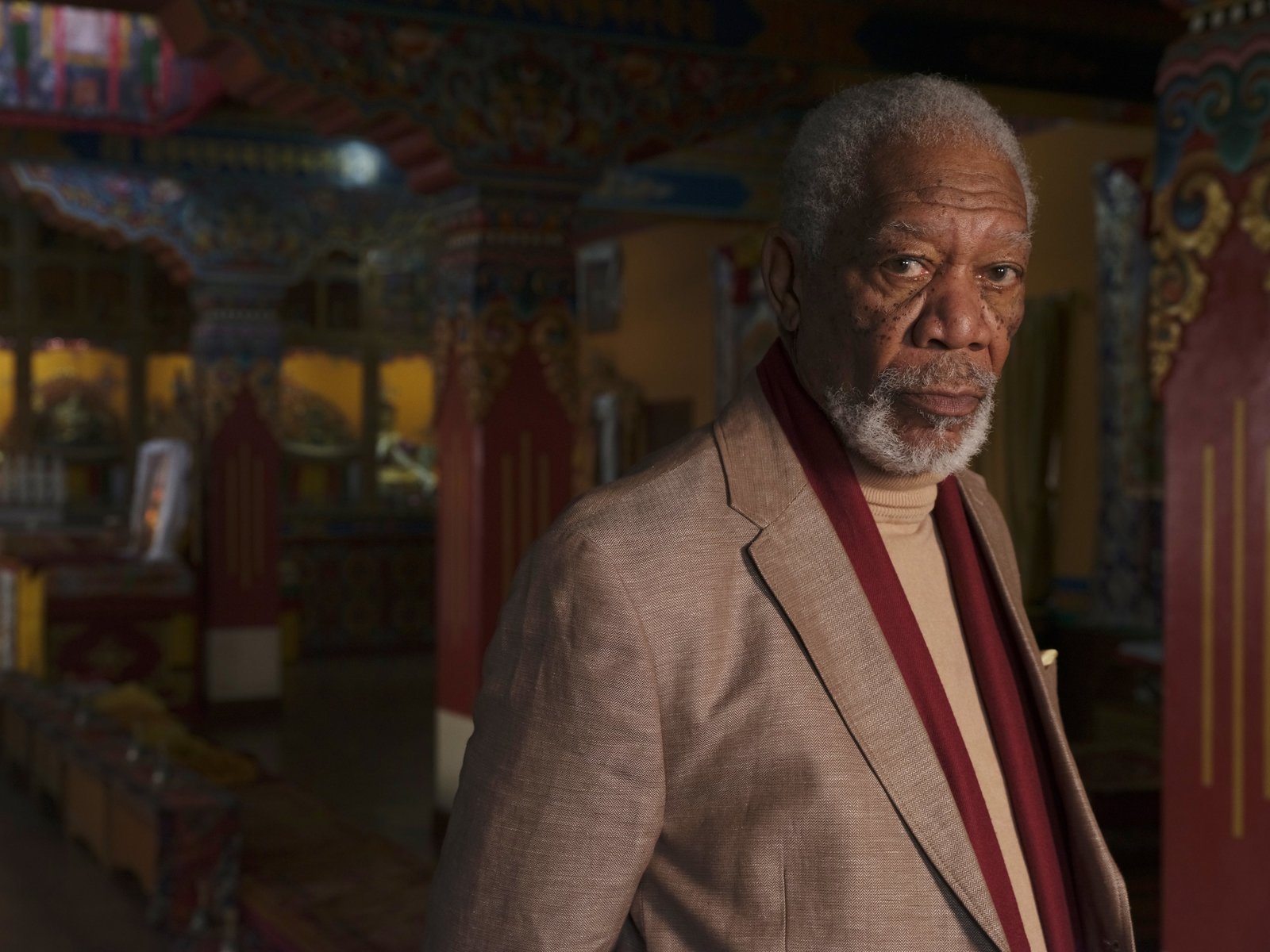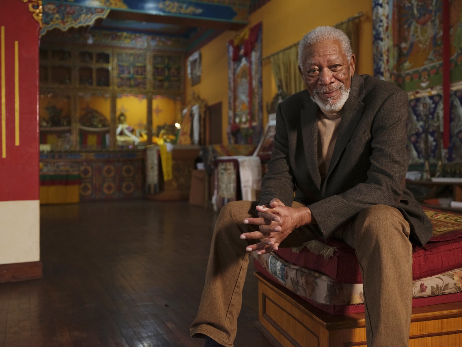 Göttliche GeheimnisseNepal – Host Morgan Freeman takes a moment to pose during production at the Ka-Nying Shedrub Ling Monastery.Bild: © National Geographic