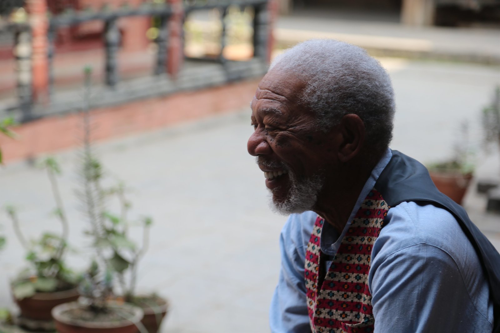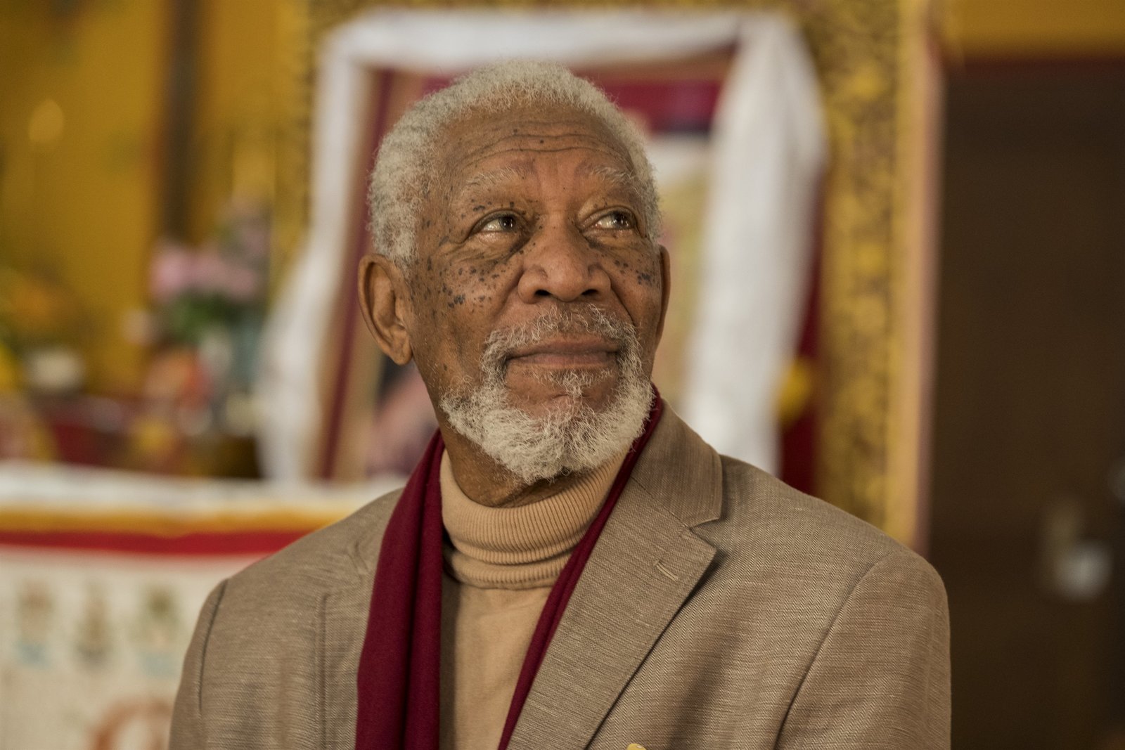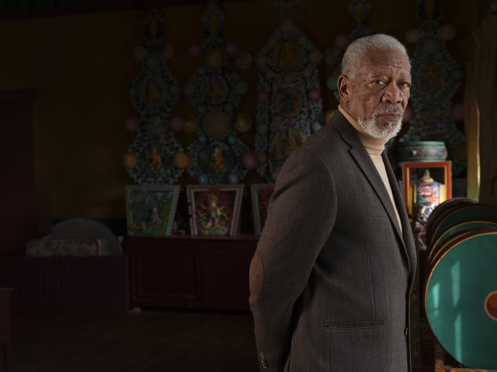 Göttliche GeheimnisseNepal – Host Morgan Freeman takes a moment to pose during production at the Ka-Nying Shedrub Ling Monastery.Bild: © National Geographic