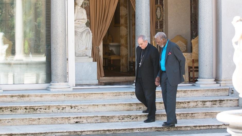 TodsündenMorgan Freeman and Roberto Rusconi laugh on set at the San Bevignate church.Bild: © National Geographic / Maria Bohe