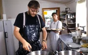Wiener Schnitzel"Mozart und Meisel", "Wiener Schnitzel." Meisel eröffnet das alte Gasthaus 'Zur Zukunft' mit einem Schnitzelessen. Einem Bierfahrer, der als Erster gegessen hat, wird unheimlich schlecht. Lucy dreht einen Werbespot über Schnitzel.Im Bild (v.li.): Götz Kauffmann (Meisel), Andreas Vitasek (Axel Mozart).Bild: © ORF/Mungo-Film