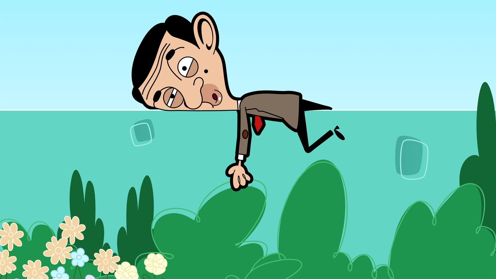 Die Wildnis ruftTypisch Mr. Bean! Er hat vergessen die Handbremse seines Minis zu ziehen und nun ist das Auto in den See gerollt.Bild: © Boomerang