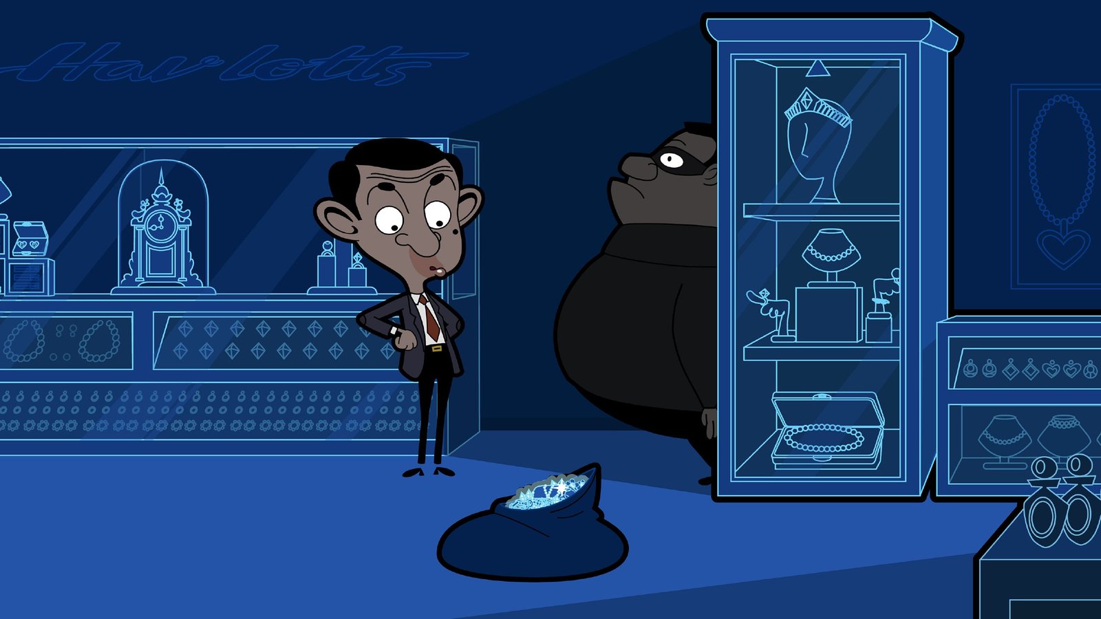 Nachts im KaufhausMr. Beans (li.) fröhliche Expedition duch das nächtliche Kaufhaus findet ein schnelles Ende: Ein Einbrecher befindet sich in der Schmuckabteilung!Bild: © SUPER RTL