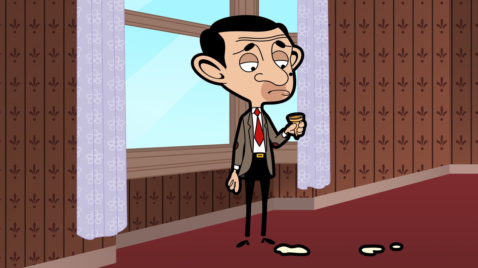 Leckeres EisKaum zu Hause angekommen, stellt Mr. Bean fest, dass sein Eis bereits geschmolzen und auf dem Teppich verteilt ist.Bild: © Boomerang (DE) / Tiger Aspect Productions 2014 Ltd