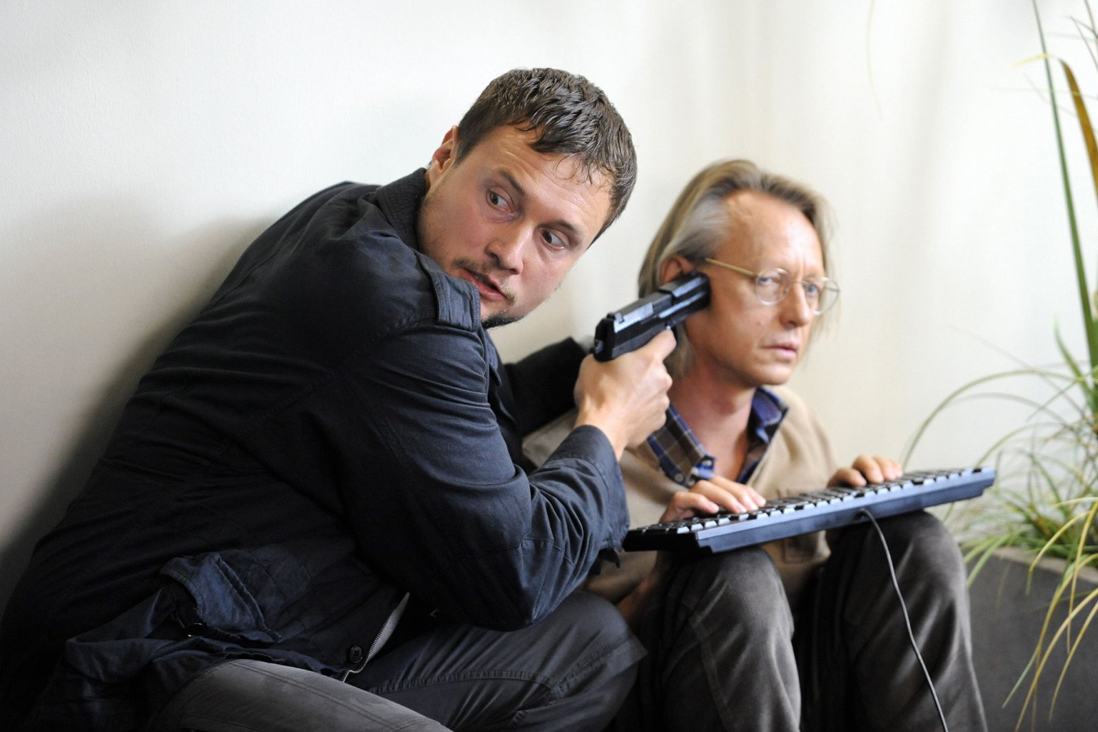 Es reicht!In der Agentur für Arbeit kommt es zu einer Geiselnahme. Heino Kurz (Maximilian Laprell, l.) nimmt den Sachbearbeiter Hugo Lienhart (Andreas Wimberger, r.) als Geisel.Bild: © ARD/Günther Reisp