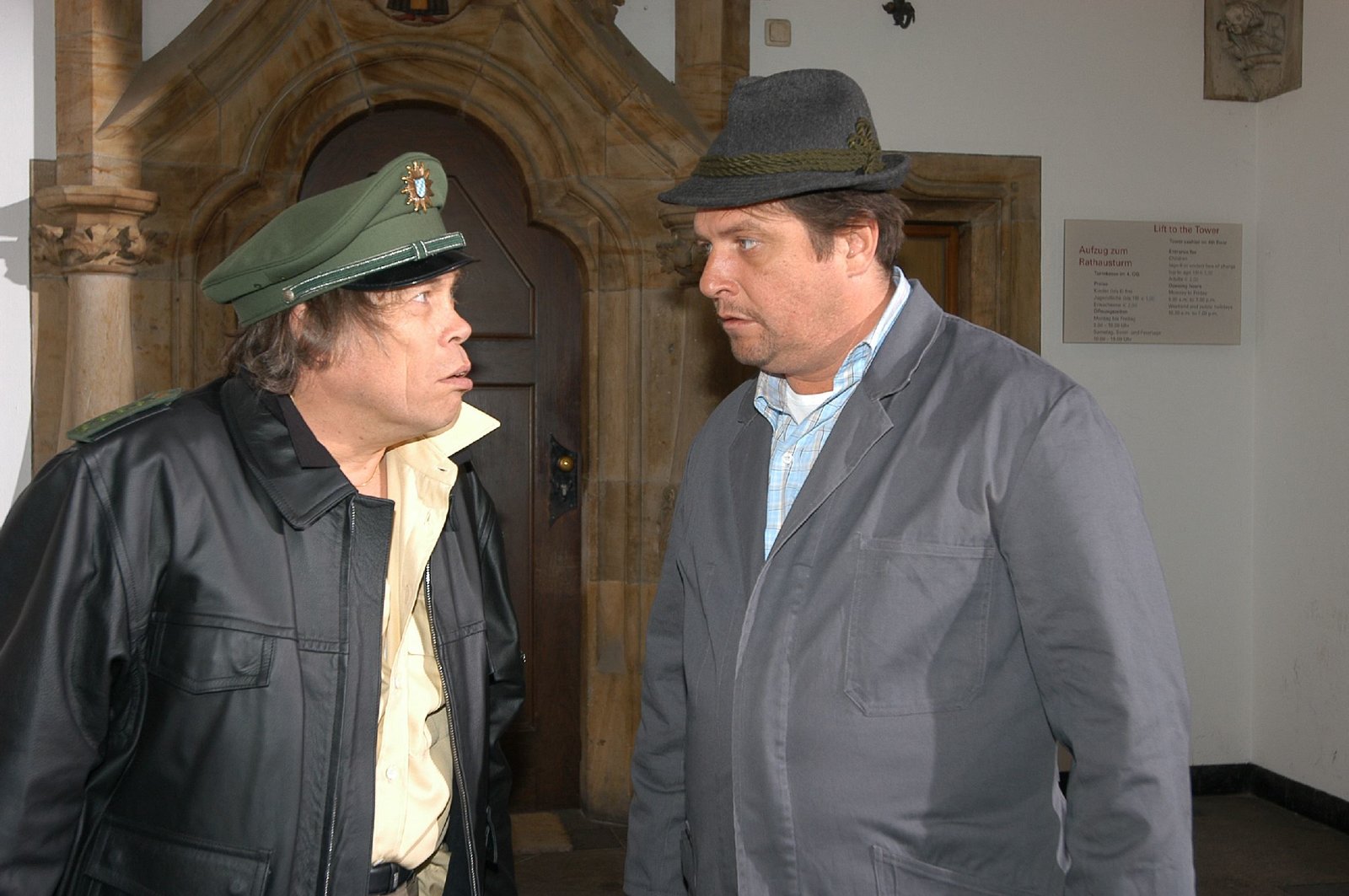 Zu spätUniform getauscht: der Hausmeister vom Rathaus (Klaus Stiglmeier) und Polizist Xaver Bartl (Andreas Giebel).Bild: © BR/Munich Press