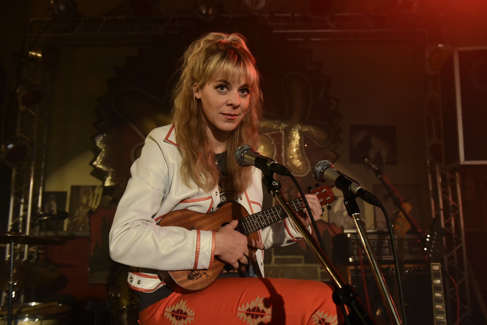 Leben und Sterben in SchwabingAngelika Flierl (Bernadette Heerwagen) singt auf der Bühne der Gaststube.Bild: © ZDF und Jürgen Olczyk.