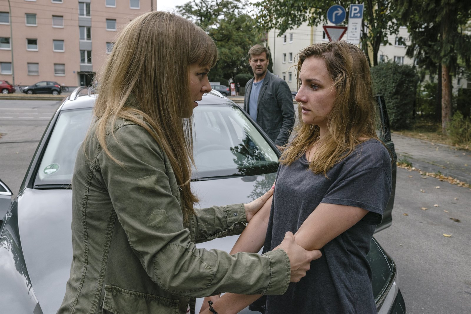 Wo bist Du, FeiglingNina Kurth (Karoline Teska, r.) rennt auf die Straße - Harald Neuhauser (Marcus Mittermeier, M.) kann im letzten Moment bremsen. Kommissarin Angelika Flierl (Bernadette Heerwagen, l.) stürzt zu ihr und beruhigt die traumatisierte Frau.Bild: © ZDF und Hendrik Heiden./Hendrik Heiden