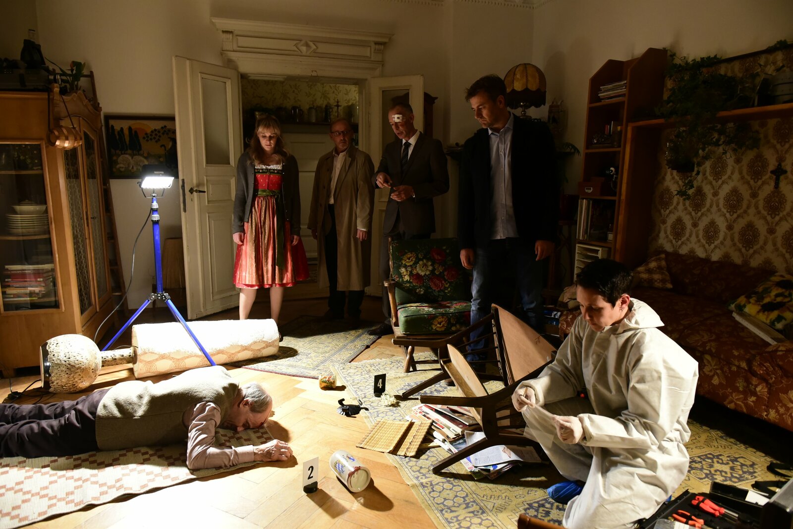 Die ganze Stadt ein DeppBestandsaufnahme am Tatort: Ein Nachbar von Kriminaloberrat Zangel wurde in seiner Wohnung ermordet. V.l.n.r.: Angelika Flierl (Bernadette Heerwagen), Ludwig Schaller (Alexander Held), Zangel (Christoph Süß), Harald Neuhauser (Marcus Mittermeier). Am Boden liegend: Das Mordopfer Josef Kleint (Nikolaus Paryla).Bild: © ZDF und Jürgen Olczyk.