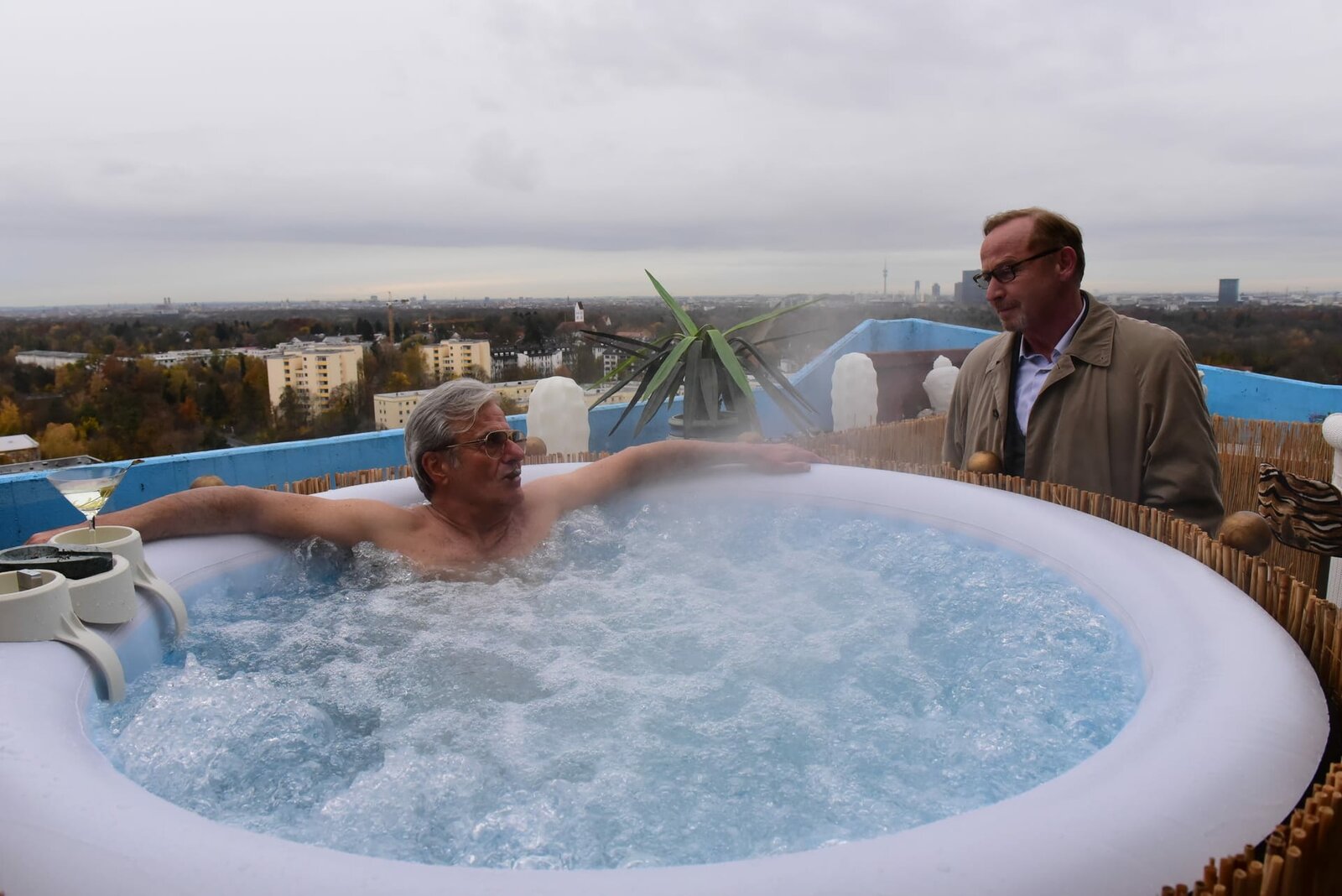 Der Letzte seiner ArtIm Whirlpool über den Dächern von München empfängt Gustav Schmidinger (Martin Umbach, l.) Ludwig Schaller (Alexander Held, r.) zur Befragung mit der Vermutung, dass er selbst das Opfer sein sollte.Bild: © ZDF und Jürgen Olczyk.
