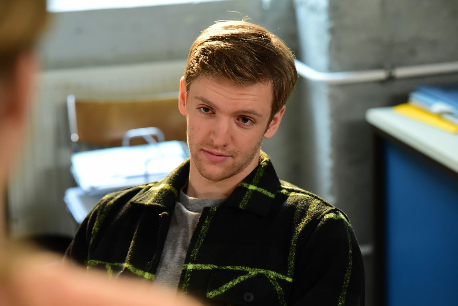 Das Kamel und die BlumePatrick Schubert (Timur Bartels) ist erschrocken, als er während des Verhörs erfährt, dass Karims Handy geortet werden konnte. Er versucht, cool zu wirken.Bild: © ZDF und Jürgen Olczyk./Jürgen Olczyk