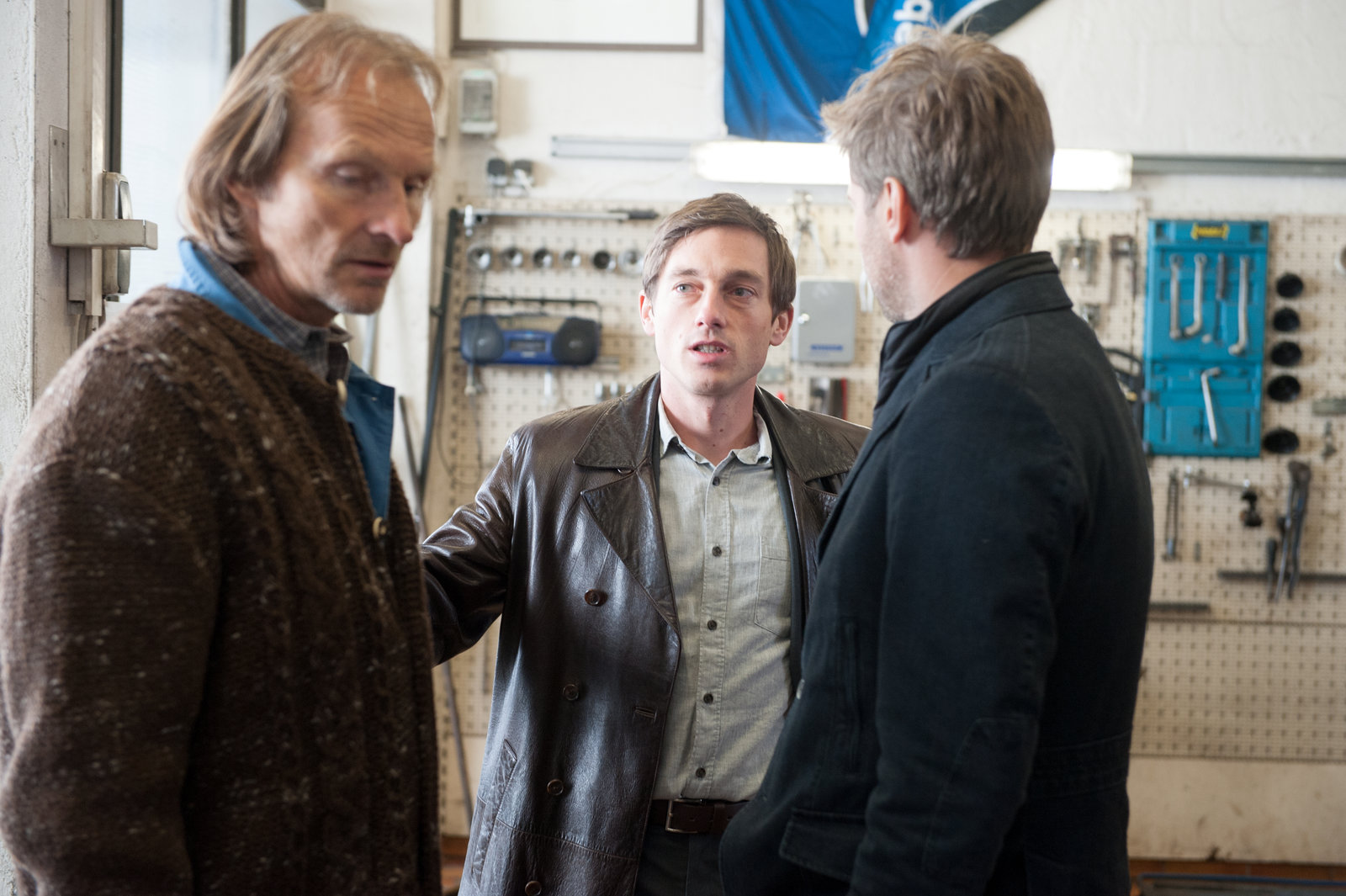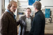 Wir sind die NeuenHarald (r.) befragt Entfellner (Eisi Gulp, l.) und Toni (Volker Bruch, m.) in der Werkstatt.Bild: © ZDF/Jürgen Olczyk