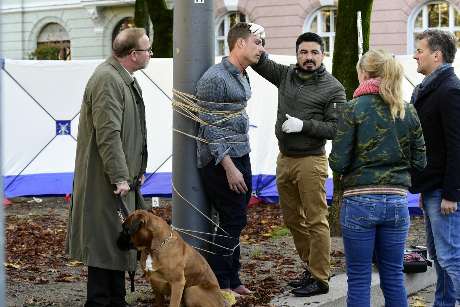 Leben und Sterben in SchwabingLudwig Schaller (Alexander Held, l.), Angelika Flierl (Bernadette Heerwagen, 2.v.r.) und Harald Neuhauser (Marcus Mittermeier, r.) werden wegen einer gefundenen Leiche (Leo Reisinger, 2.v.l.) gerufen und begeben sich auf Spurensuche. Dr. Heise (Ercan Karacay, M.) berichtet über die genaue Todesursache.Bild: © ZDF/Jürgen Olczyk