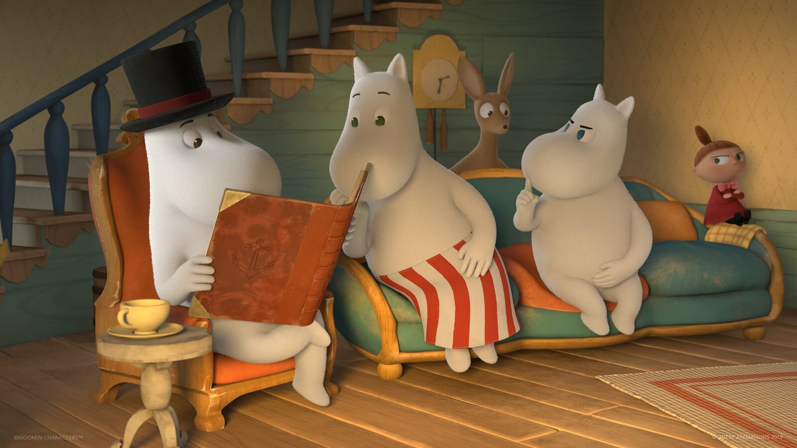 Eine GeistergeschichteAm Abend liest Muminpapa (l.) eine Geschichte vor. Sniff (3.v.r.) hat das unsichtbare Kind erschreckt.Bild: © ZDF/Moomin Characters/Gutsy Animations 2019