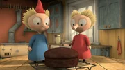 Der ZauberhutDie kleinen Besucher Tofslan (l.) und Vifslan (r.) nehmen sich den Schokoladenkuchen vor.Bild: © KiKA