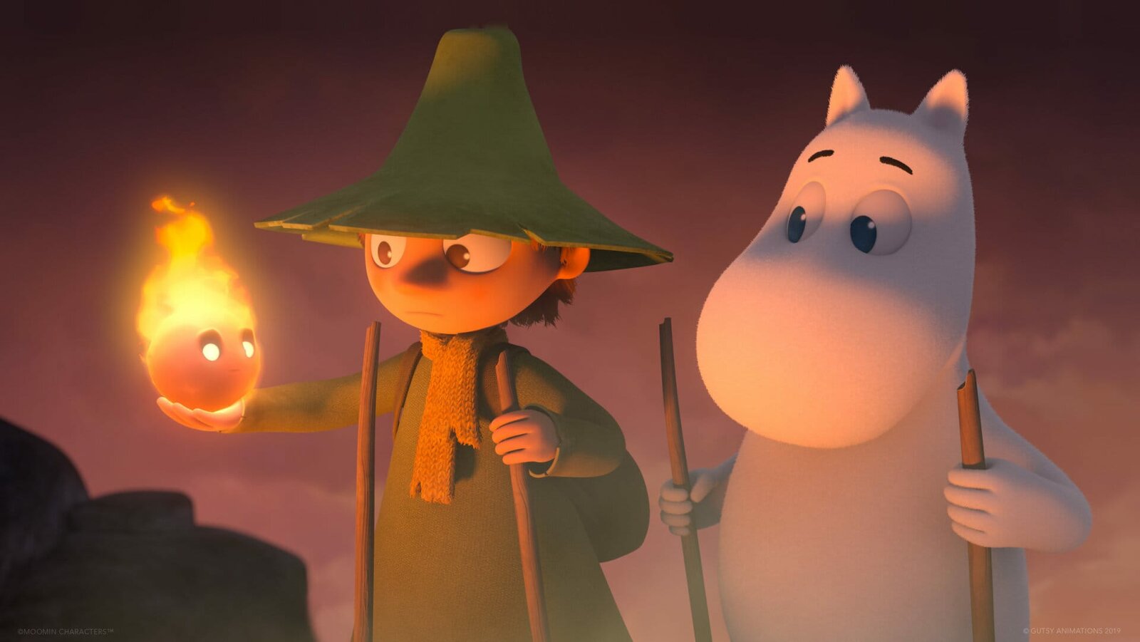 Der FeuergeistSnufkin (l.) möchte den kleinen Feuergeist zurück zum Vulkan bringen. Mumin begleitet ihn.Bild: © ZDF und © Moomin Characters – © Gutsy Animations 2019.