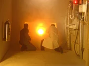 Die Geheimnisse der MondlandungWith three astronauts trapped inside, two gantry workers attempt to open the hatch to the Apollo 1 Command Module while a fire blazes inside, fed by a pure oxygen environment. (Recreation)Bild: © NGT / Anne Carpenter