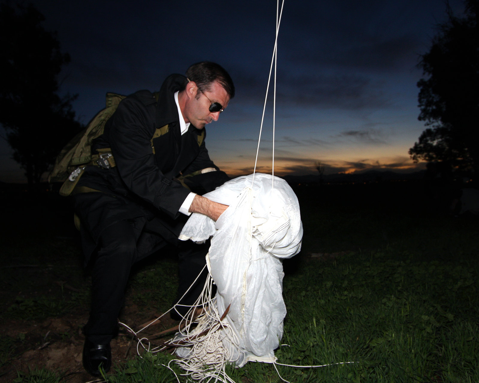 Der verschwundene LuftpiratREENACTMENT: D.B. Cooper was the first man in U.S. history to hijack a plane for ransom. The mystery of his disappearance after hijacking the plane has frustrated the FBI for nearly forty years. After he leapt out of the back of a commercial jet with a parachute and $200,000 he was never seen again--dead or alive. Pictured here, Cooper lands safely on the ground. (photo credit © EDGE WEST, LLC/J Grant Buckerfield)Bild: © J Grant Buckerfield / J Grant Buckerfield / National Geographic Channels / © EDGE WEST, LLC