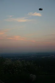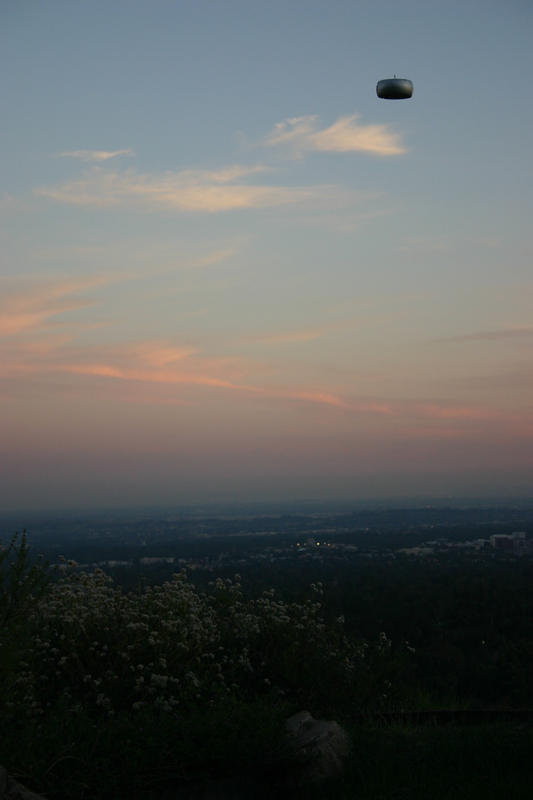 Außersinnliche WahrnehmungenPasadena, CA - Dr. Michael Shermer provides a perfect visual of how to fake a UFO photo. This one taken over the city of Los Angeles is simpky 2 hub caps put together and tossed into the air.Bild: © National Geographic Channels