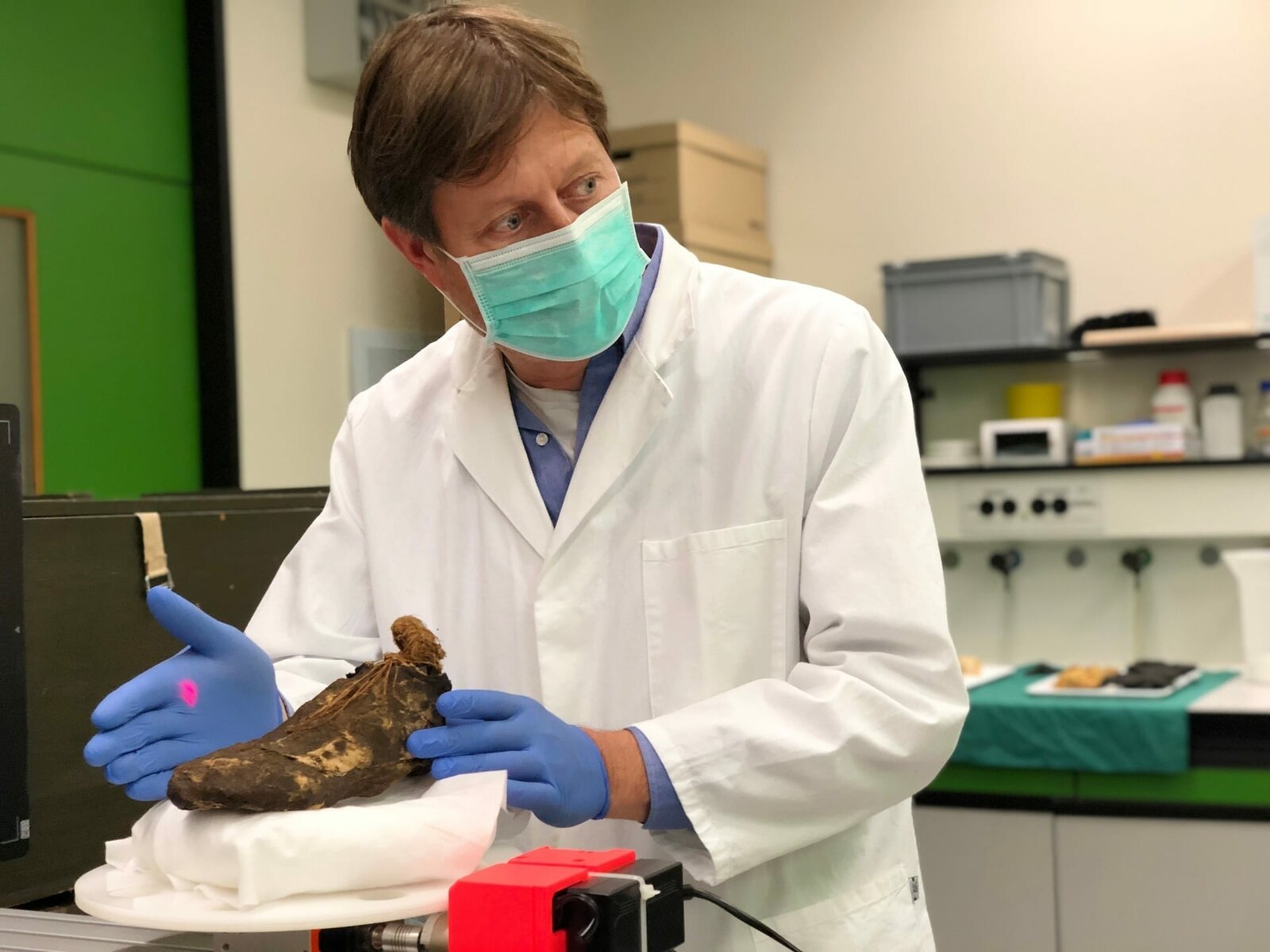 Der Fluch des PharaosNeueste Erkenntnisse der Wissenschaft: Evolutionsmediziner Prof. Dr. Frank Ru?hli mit einem mumifizierten Fuß.Bild: © ZDF und Matthias Kraus./Matthias Kraus