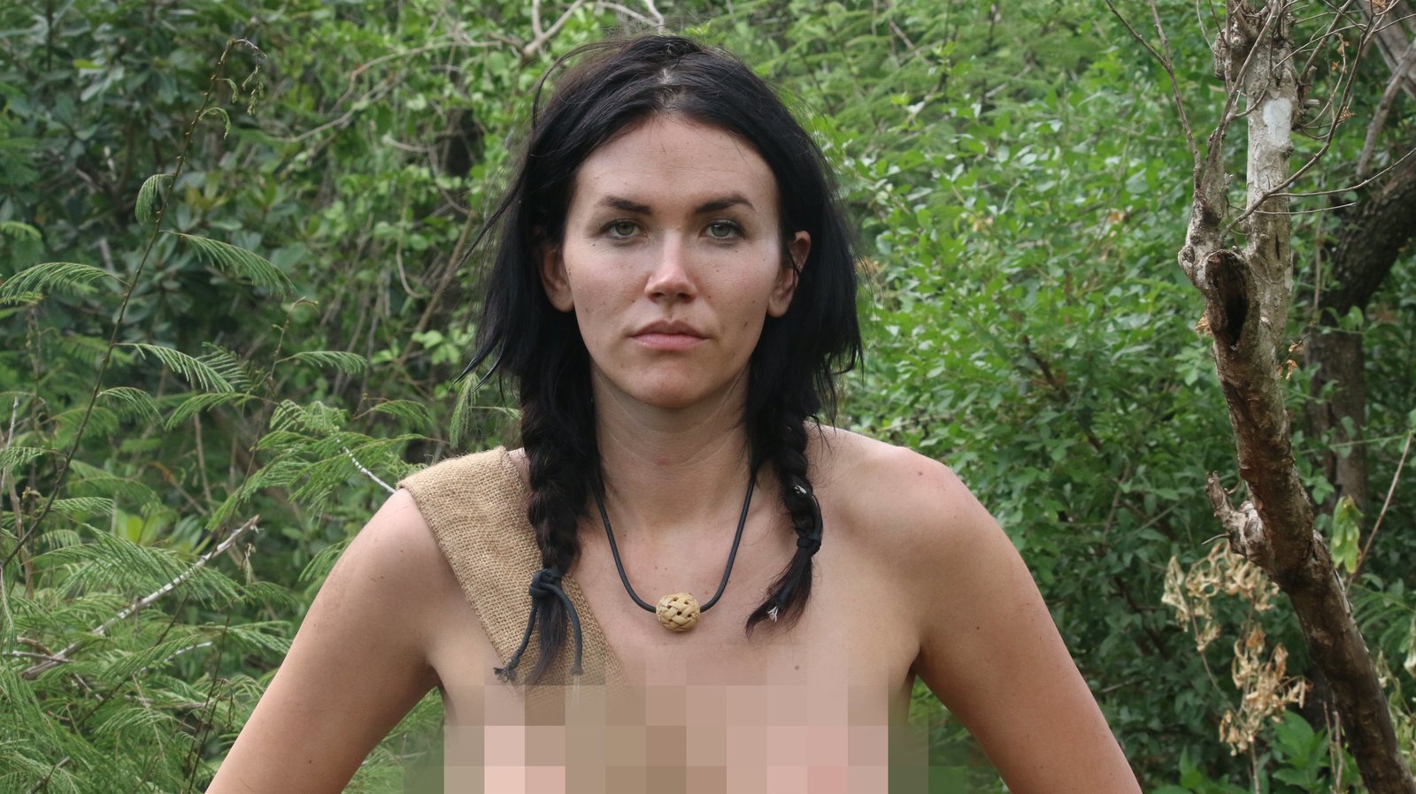Folge 20Gia, next to leaves, poses with a survival tool.Bild: © DMAX