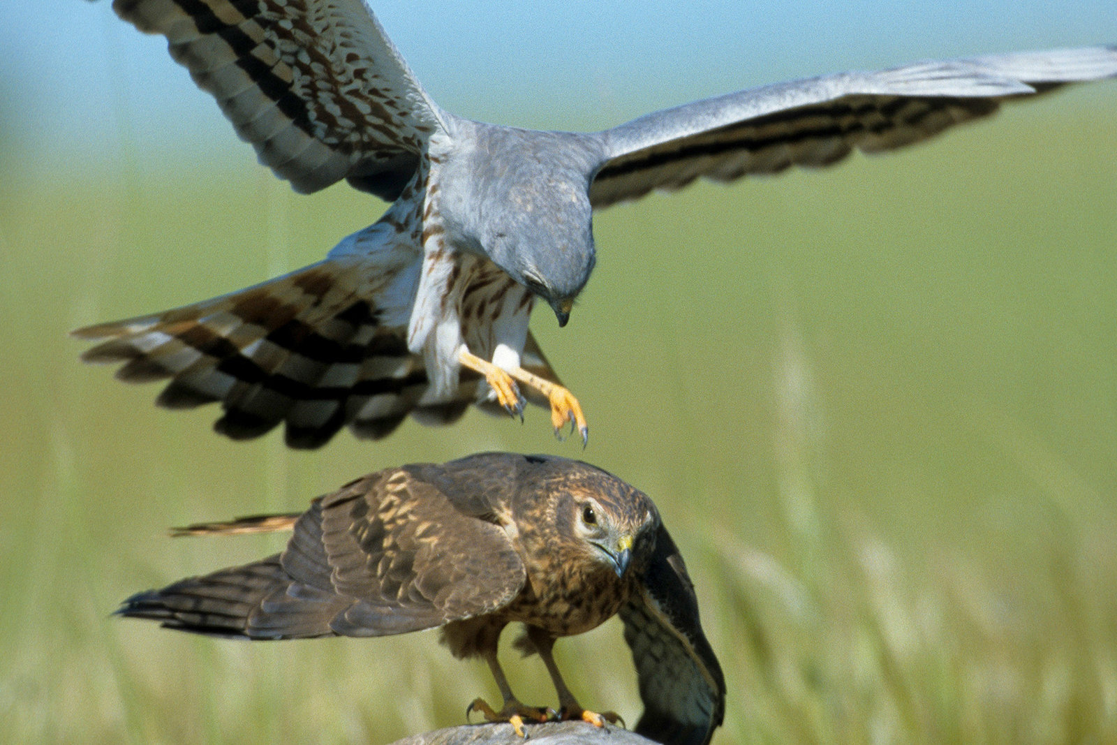 Wiesenweihen kurz vor der Paarung. Das Männchen ist grau, das Weibchen braun.Bild: © BR / © Dietmar Nill