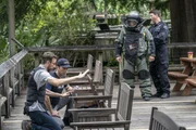 Kugeln aus GlasSuchen am Tatort nach einem Beweis, dass Sebastian Lund (Rob Kerkovich, l.) in Notwehr einen Menschen getötet hat: Special Agent Dwayne Pride (Scott Bakula, M.) und Gerichtsmedizinerin Dr. Loretta Wade (CCH Punder, r.) ...Bild: © 2017 CBS Broadcasting, Inc. All Rights Reserved