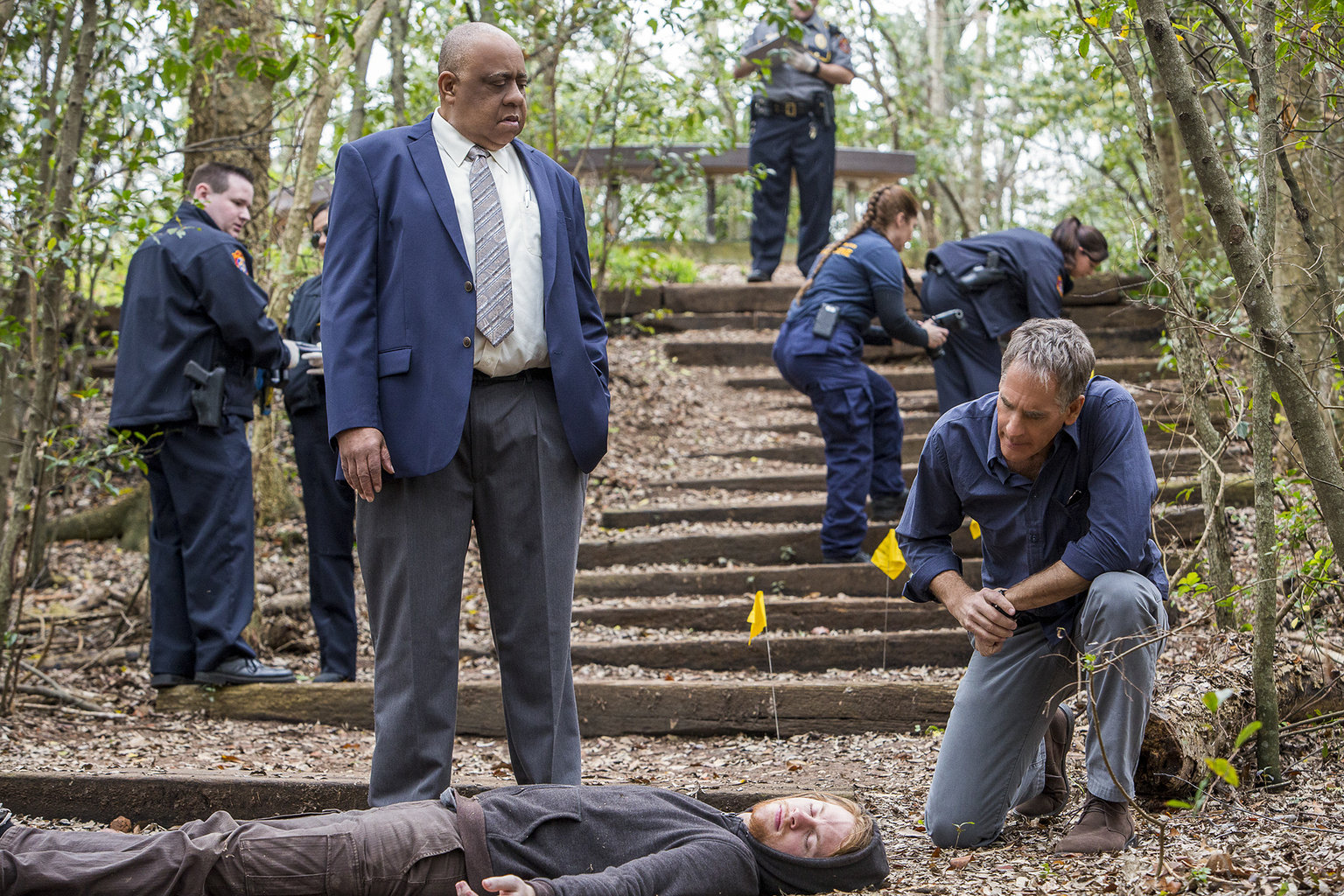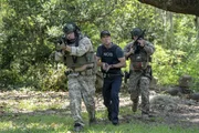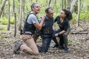 Kugeln aus GlasSuchen am Tatort nach einem Beweis, dass Sebastian Lund (Rob Kerkovich, l.) in Notwehr einen Menschen getötet hat: Special Agent Dwayne Pride (Scott Bakula, M.) und Gerichtsmedizinerin Dr. Loretta Wade (CCH Punder, r.) ...Bild: © Skip Bolen / ©2017 CBS Broadcasting, Inc. All Rights Reserved