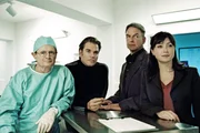 Sarg aus EisenDie Anthropologin Elaine Burns öffnet vor laufender Kamera einen Eisensarg aus der Zeit des amerikanischen Bürgerkrieges. Neben der gut erhaltenden Leiche findet sie ein Mobiltelefon. McGee (Sean Murray, l.), Tony (Michael Weatherly, 2.v.l.), Gibbs (Mark Harmon, 2.v.r.) und Abby (Pauley Perrette, r.) werden mit dem Fall beauftragt ...Bild: © TM & © 2006 CBS Studios Inc. All Rights Reserved.