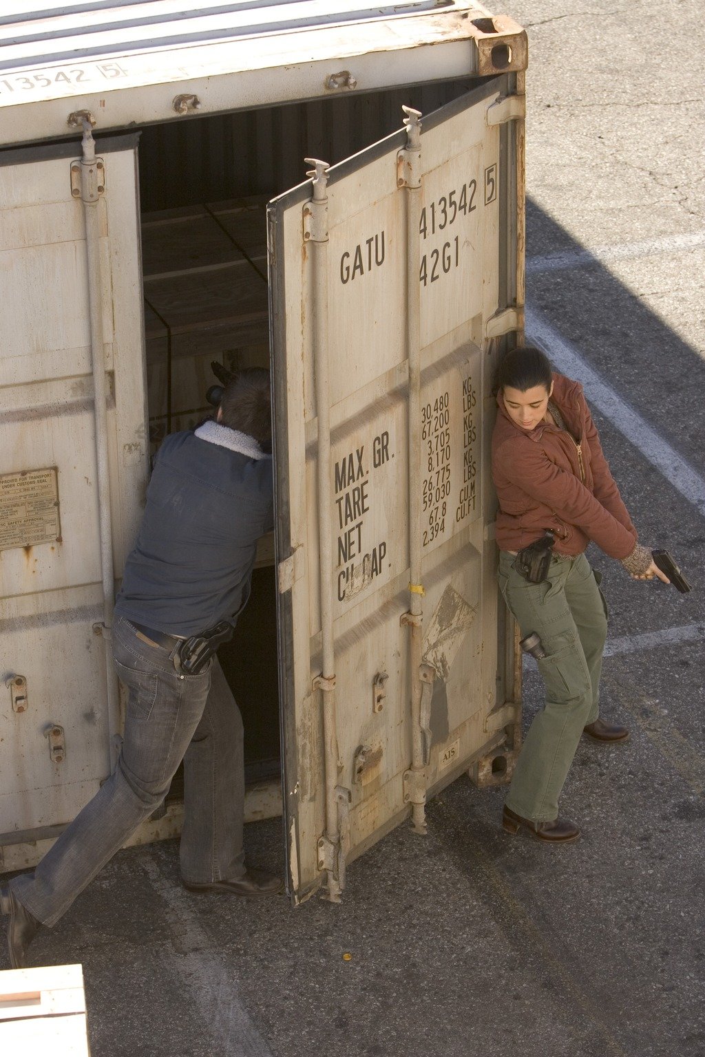 Die Spur des GeldesZiva (Cote de Pablo, r.) und Tony (Michael Weatherly, l.) sind am Hafen von Norfolk. Sie laufen zwischen Containern umher, als plötzlich auf sie geschossen wird. Sie nehmen in einem offen stehenden Container Deckung, doch dann wird die Tür zu geschlagen und sie sitzen fest ...Bild: © ProSieben Media AG TM & © 2006 CBS Studios Inc. All Rights Reserved.