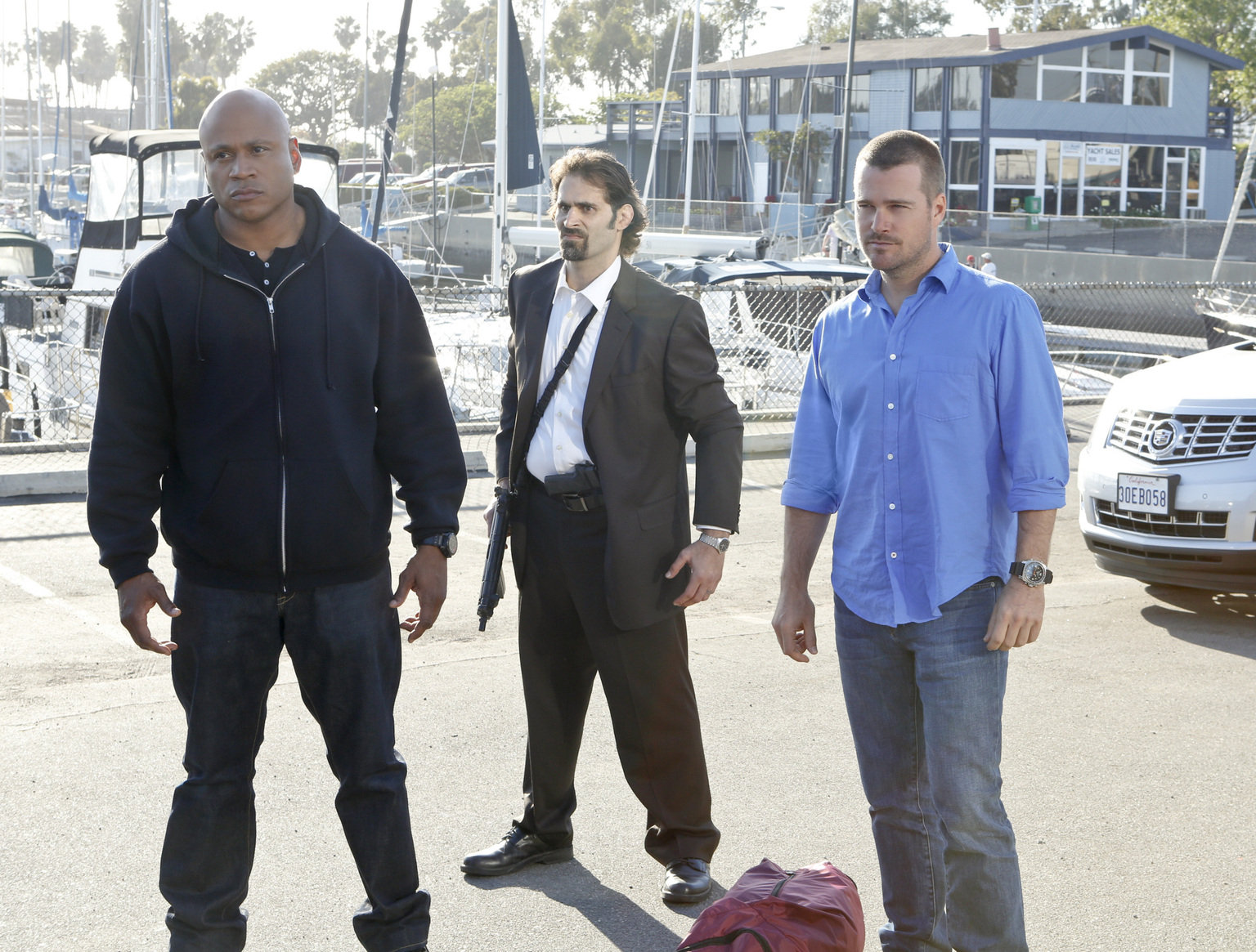Schalom"Navy CIS: L.A.", "Drei Herzen." Der Undercover-Agent Paulo Angelo wird verdächtigt zur Bande des Drogendealers Brunson übergelaufen zu sein, die eine große Menge der hochgefährlichen Droge 'Krokodil' ins Land schmuggeln. Sam und Callen wollen nun Angelo verhören. Das Navy CIS muss sich 100% bei ihrer Arbeit auf Angelo verlassen können. Doch Angelo hat eine Affäre mit Brunsons Freundin angefangen.Im Bild (v.li.): LL Cool J (Special Agent Sam Hanna), Chris O'Donnell (Special Agent G. Callen).Bild: © CBS Studios Inc. All Rights Reserved. Lizenzbild frei