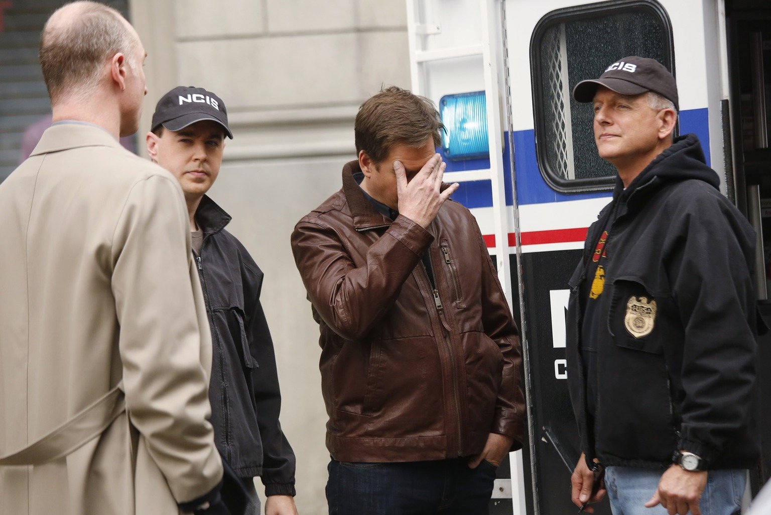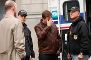 Schüsse am SonntagAls Tony (Michael Weatherly, 2.v.r.) sich mit seinem Vater in einem Hotel treffen will, wird er prompt in einen Fall verwickelt und muss das private Treffen erst mal vertagen. McGee (Sean Murray, 2.v.l.) und Gibbs (Mark Harmon, r.) sind sofort zur Stelle ...Bild: © CBS Television Lizenzbild frei