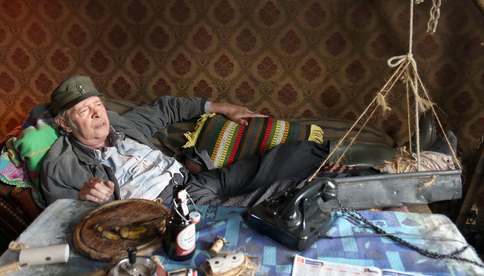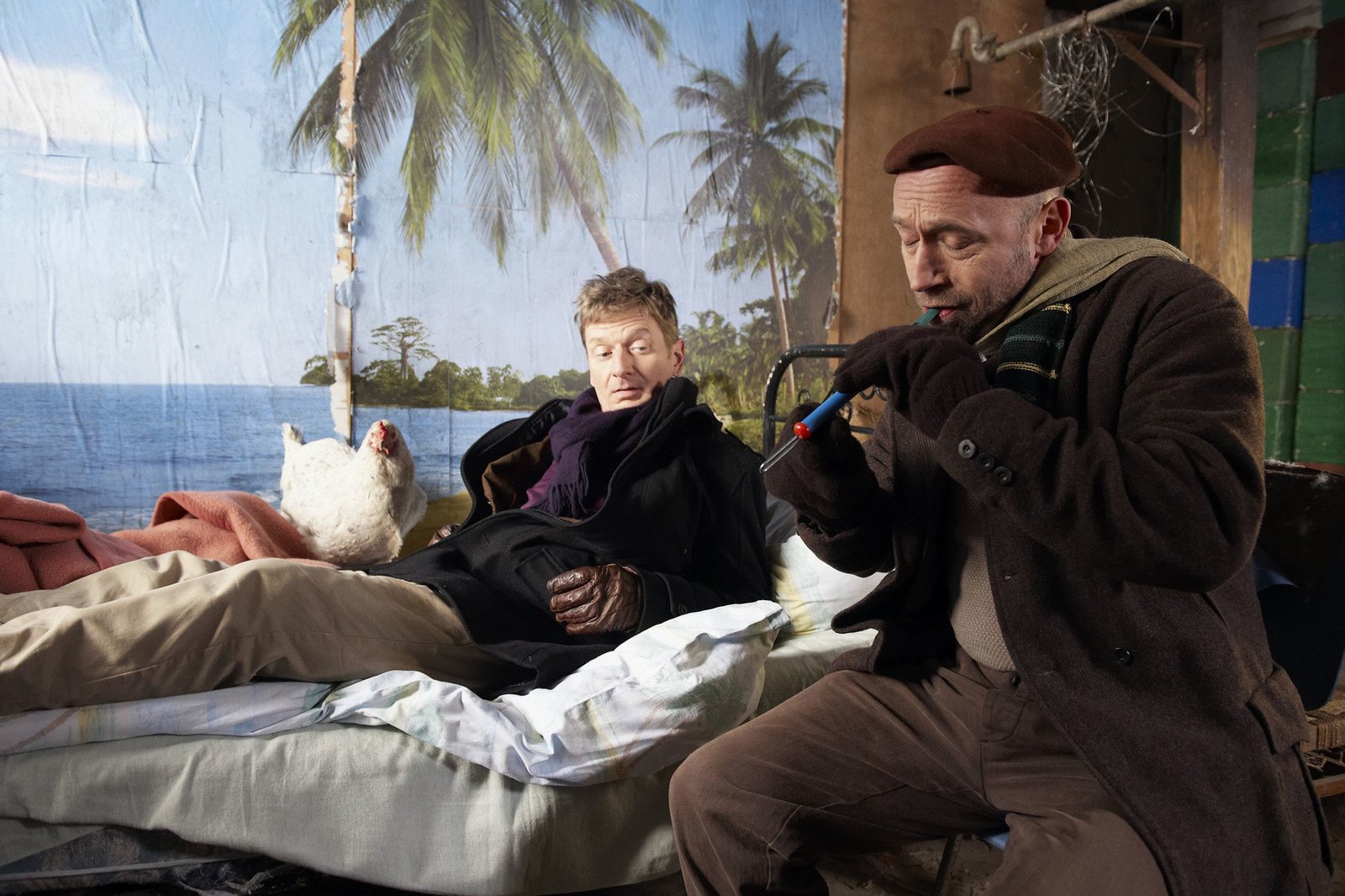 StadtschinkenKuno (Sven Walser) musiziert für den langsam erwachenden „Stadtschinken“ Markus Schnuck (Michael Kessler).Bild: © NDR/Sandra Hoever