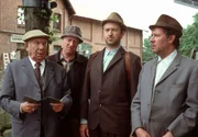 KömkuchenBürgermeister Schönbiehl (Günter Kütemeyer, re.) untersagt Brakelmann (Jan Fedder, zweiter v. li.), Adsche (li.) und Kuno (zweiter v. re.) das Betreiben einer illegalen Kneipe in Brakelmanns Hawaii- Zimmer.Bild: © NDR/Manju Sawhney