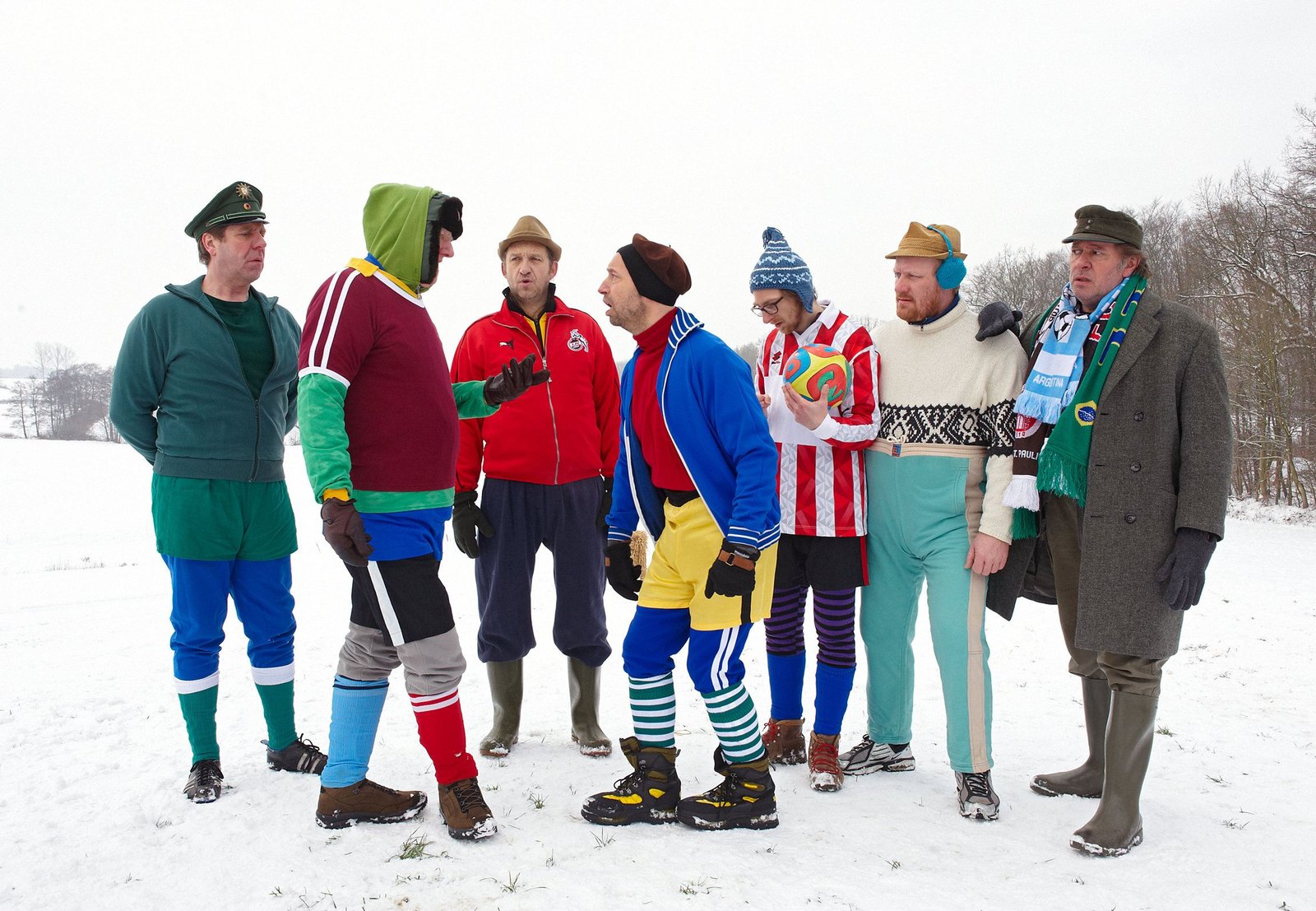 Der Ball rolltvlnr: Peter (Uwe Rohde), Shorty (Axel Olsson), Adsche (Peter Heinrich Brix), Kuno (Sven Walser), Heinz (Hendrik von Bültzingslöwen), Arno (Sönke Korries) und Brakelmann (Jan Fedder) versammeln sich auf der Harksenwiese zum Fussballspielen.Bild: © NDR/Sandra Hoever