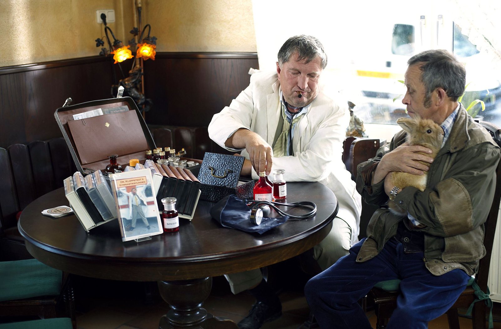 ChefvisiteDr. Rufus Kloppstedt (Veit Stübner, links) behandelt im Dorfkrug Mensch und Tier.Bild: © NDR/Sandra Hoever