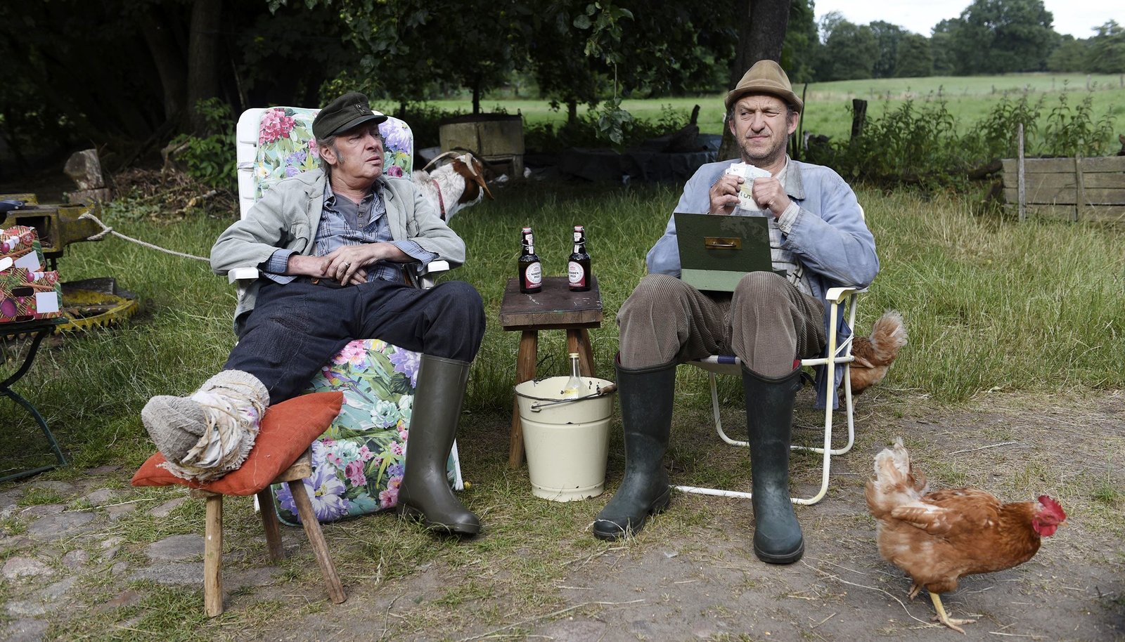 StadtschinkenNDR Fernsehen NEUES AUS BÜTTENWARDER, "Stadtschinken", am Montag (09.04.12) um 19:30 Uhr. Kurt Brakelmann (Jan Fedder) und Adsche Tönnsen (Peter Heinrich Brix) vereint in ländlicher Idylle.Bild: © NDR/Sandra Hoever