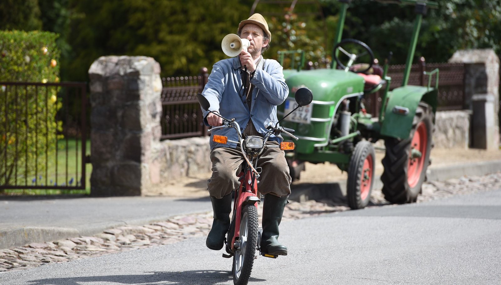 RadioAdsche (Peter Heinrich Brix) wirbt lautstark für seinen neuen Radiosender „Radio Adsche“.Bild: © NDR/Nicolas Maack