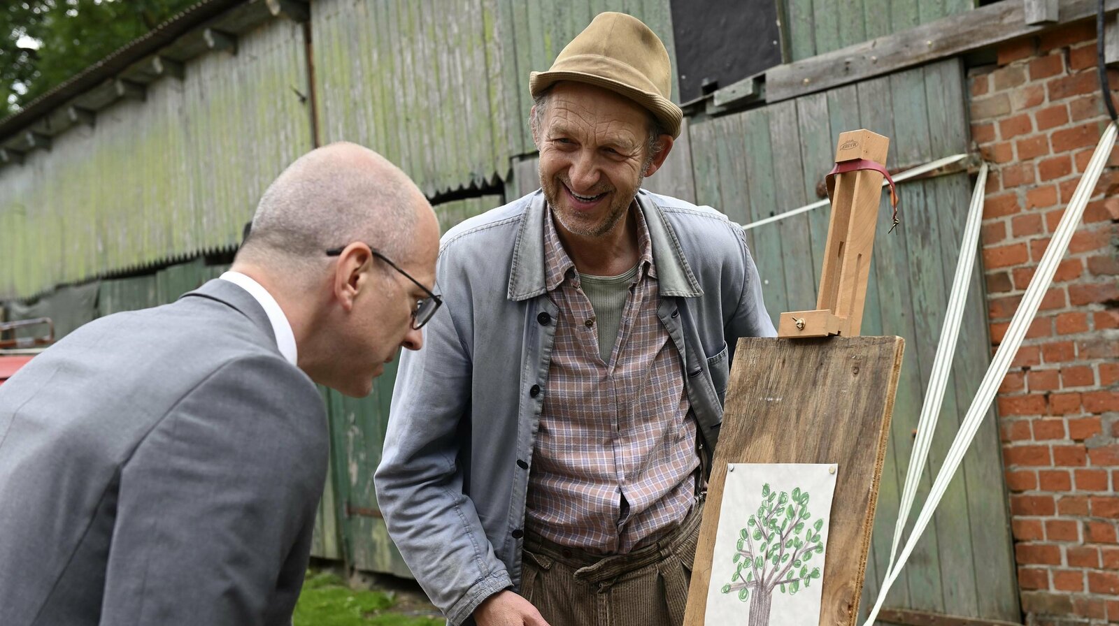 KunstNDR Fernsehen NEUES AUS BÜTTENWARDER, "Kunst", am Samstag (26.12.20) um 17:35 Uhr. Der Kunstsachverständige Herr Wittland (Simon Hatzl) sieht Adsches (Peter Heinrich Brix) Erlentrillich auf dem Bild nicht. © NDR/Nicolas Maack, honorarfrei - Verwendung gemäß der AGB im engen inhaltlichen, redaktionellen Zusammenhang mit genannter NDR-Sendung bei Nennung "Bild: NDR/Nicolas Maack" (S2). NDR Presse und Information/Fotoredaktion, Tel: 040/4156-2306 oder -2305, pressefoto@ndr.deBild: © NDR/Nicolas Maack / NDR Presse und Information