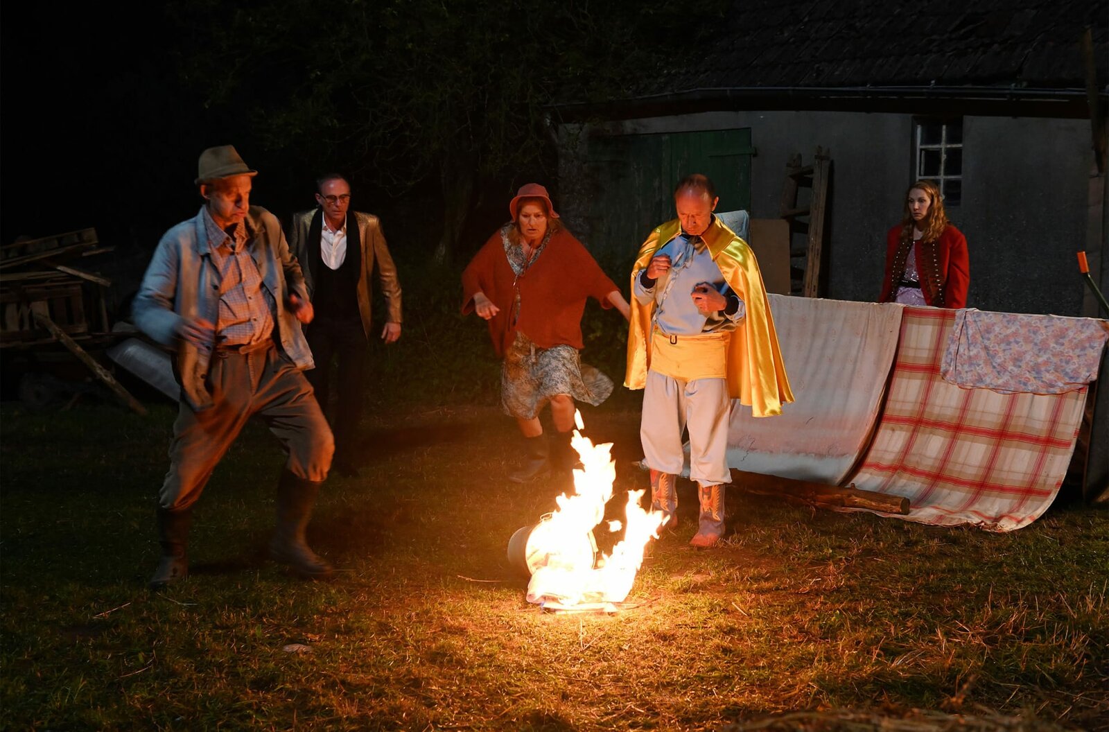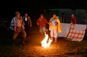 Keine 8 mehrUm ein Haar wäre Krischans Erbe verbrannt. Adsche (Peter Heinrich Brix v.l.n.r.), Jürgen (Dirk Martens), Ylvie (Suzanne von Brorsody) und Kuno (Sven Walser) retten was geht.Bild: © NDR/Nicolas Maack