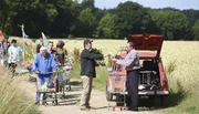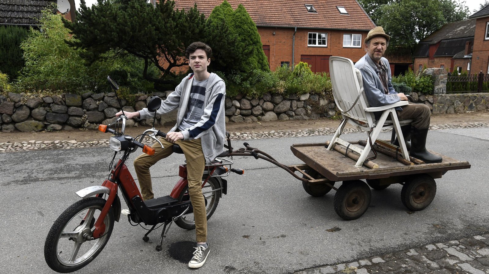 WeWeWeManuel (Leonard Seyd, li.) kutschiert Opa Adsche (Peter Heinrich Brix, re.) zum Internet-Hotspot von Büttenwarder.Bild: © NDR/Uwe Ernst