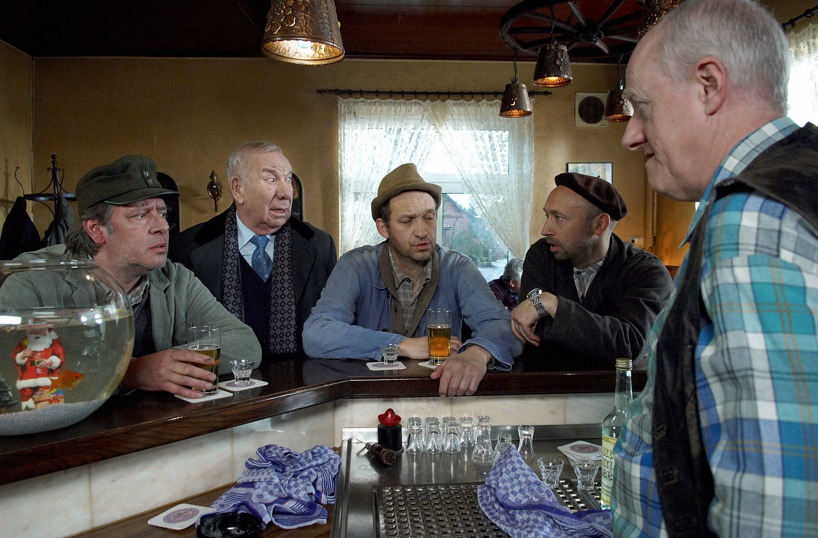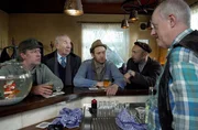 SilvesterEs ist Silvester - alle treffen sich im Dorfkrug und sind sich einig, dass man dieses Jahr auf keinem Fall so feiern will, wie in den anderen Jahren. v.l.n.r.: Kurt Brakelmann (Jan Fedder), Waldemar Schönbiehl (Günter Kütemeyer), Adsche (Peter Heinrich Brix), Kuno (Sven Walser), Wirt Shorty (Axel Olsson)Bild: © NDR/Sandra Hoever